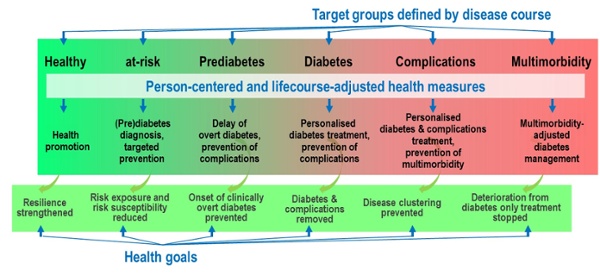 将分子分析谱与个体特质、目标和偏好相结合,可以优化糖尿病预防和治疗措施的精确性。针对患者具体的糖尿病特征以及多重用药情况的鉴别对更多个性化治疗方案的实施具有促进作用。根据合并症调整后的糖尿病护理承认功能储备和认知表现上的极大差异,这些因素决定了自我管理的能力、治疗获益的多少以及需要住院的可能性。